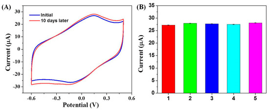 After the electrode was stored in N2-saturarted PBS (pH = 7.0) at 4 °C for 10 days, the anodic peak current increased by 4.5% and the cathodic peak current increased by 6.4% against the original value (Figure 6A), which indicated the sensor has good stability. The reproducibility was determined from the current response of five independent sensors to 200 μM H2O2. As shown in Figure 6B, the calculated relative standard deviation value (RSD) was only 1.23%. The good stability and reproducibility were attributed to the good biocompatibility of ERGO-Nafion/AuNPs composite and strong interactions between ERGO-Nafion and AuNPs. Finally, the reliability of the biosensor electrode was performed by measuring the current response upon the addition of different amounts of H2O2 into a 1.0 mM of H2O2 solution. The results are summarized in Table 1. The relative deviation of the measured value to the truth value was less than 3%, inferring the great reliability of the biosensor.