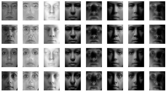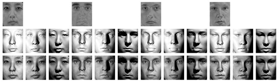 The proposed method was applied to the Yale [55] and Multi-PIE [56] databases for qualitative evaluations. Figure 5 and Figure 6 show some of the reconstruction results. Here, we can see that the method can generate relit images robustly, irrespective of the input light condition, and it can fill areas under heavy shadows. Moreover, the results are unaffected by small outliers, such as the glasses in the examples. Textures are robustly recovered without degrading the resolution, which makes the relit images more realistic, even though the method does not involve any 3D reconstruction procedures.