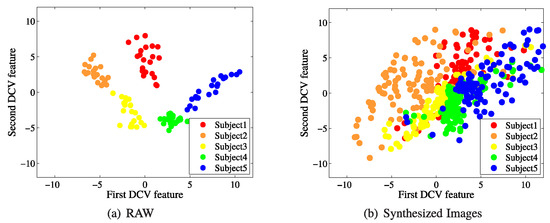 Figure 3a,b show the projection of 105 real images (5 subjects × 21 images) and 500 images (5 subjects × 100 images), which were synthesized by using the proposed method on 5 subjects among all 25 subjects into a 2D DCV feature space. In Figure 3a, for the case of real images from the CMU-PIE database, the images of each subject captured in different illumination conditions were formed into clusters, and each cluster was distributed separately in the feature space. Five-hundred synthesized images in Figure 3b were also clustered together for each subject; however, clusters partially overlap with each other due to the greater variance of each cluster. Thus, in this study, some of the illumination conditions among all 100 light conditions were limitedly selected based on the distribution of real images, and their corresponding synthesized images were used to construct an effective feature space for the face recognition system.