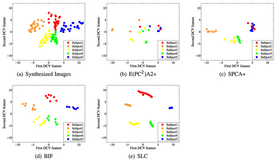 Figure 4 shows that the distribution of the synthesized images (Figure 3b) is similar to that of the real images (Figure 3a). In both subfigures (Figure 3a,b), the samples are favorably clustered according to each subject, and there is less overlap between samples for the different subjects. Meanwhile, in the distributions resulting from other methods, some of the samples belonging to the same subject are widely distributed or overlap with those of other subjects. Although the samples obtained by BIF (Figure 4d) show favorably distinguished clusters, BIF is limited when expressing diverse changes in images owing to a limited number of synthesizable images (approximately seven images); it also requires front-lighted images to generate new images. In contrast, the proposed method can generate considerably more illumination conditions, resulting in its effectiveness in dealing with possible changes in the actual illumination environment. It can also produce images containing diverse illumination conditions using a single image captured under an arbitrary illumination condition.