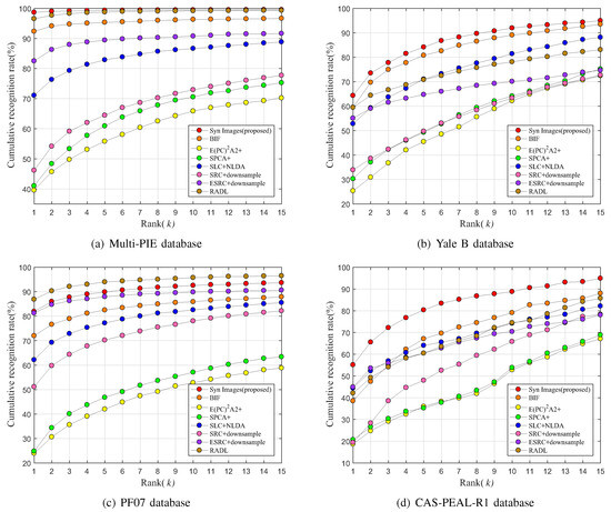 For each database, the face recognition performance was evaluated using the cumulative match score [64]. For a given probe image , the target images () are sorted by their similarity scores based on the Euclidean distance. Figure 9 shows the experimental results, where the horizontal axis represents the rank k and the vertical axis corresponds to the cumulative recognition rate of the top k matches. In Figure 9, the face recognition performance of the proposed method appears to be mostly superior to other methods at each database with respect to all features, regardless of the number of features. For the cases of E()A2+ and SPCA, face recognition in the presence of actual environmental change was somewhat ineffective because the images were generated through SVD perturbation, projection, or linear combination, with no consideration for the variation in the actual face images caused by environmental changes. Although the images generated by BIF reflect the changes in illumination conditions, BIF is limited in the number of images that can be created. On the other hand, the proposed method reflects the probable image changes from the actual environment quite effectively in the generated image and, consequently, results in better face recognition performance than that of BIF. RADL shows worse performance than the proposed method, with the exception of experiments on the PF07 database; in particular, for the Yale B and the CAS-PEAL-R1 databases, RADL’s performance is far worse than the best performance achieved by the other methods. Note that the Multi-PIE and PF07 databases contain only horizontal variations of illuminations, such as the CMU-PIE database used for training all the face recognition methods, unlike the Yale B and the CAS-PEAL-R1 databases, which also contain vertical variations. Although the RADL method shows a slightly higher recognition rate than the proposed method for the PF07 database, the difference is not significant, and both the proposed method and the RADL method demonstrate good performances. However, for Yale B and CAS-PEAL-R1, which have more varied illumination changes, RADL is not as good as the other algorithms. This suggests that the proposed method has a better generalization performance.