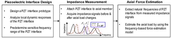 Previous works have proven that the peaks of impedance signatures represent the modal frequencies of the PZT-driven system [31,32]. This suggests that the natural frequencies of a host structure can be extracted from the resonant peaks of impedance signatures [30,33,34]. By utilizing this advantage, we developed an axial force estimation method using the impedance measurement, as shown in Figure 1. The idea was to estimate the axial load using the natural frequencies of a PZT interface structure, which were obtained from impedance measurements. The proposed method was performed through three main steps. In Step 1, a piezoelectric interface prototype was designed. Then, local dynamic characteristics of the interface were analyzed to predetermine the sensitive frequency range of impedance responses that contain the modal frequencies. In Step 2, the PZT interface prototype was attached to an axially loaded member. The impedance signatures of the PZT interface were measured before and after load change events. In Step 3, the natural frequencies of the PZT interface were extracted from the measured impedance signatures. Then, the axial force of the monitored structure was estimated using a frequency-based force estimation model.
