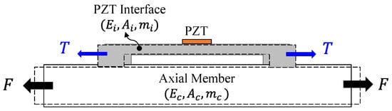 The axial load estimation method was proposed on the basis of the piezoelectric interface technique, which was originally developed to acquire sensitive impedance signatures [21]. The piezoelectric interface is typically a beam-like structure that is embedded with a PZT sensor at the middle. To monitor the axial force, a PZT interface was attached to an axially loaded member, as schematized in Figure 2. A tension force F applied to the axial member will induce an external axial load T into the PZT interface. The variation of F will result in the alternation of T, leading to the shift in the modal frequency of the interface. By catching the frequency shift in the impedance signatures, it is possible to detect and estimate the variation of the applied force F.