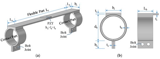 The design parameters of the interface device are defined in Figure 3. Briefly, the flexible part has width bi, length Li, and thickness ti; the hoop of the contact part has outer diameter db, length Lb, and thickness tb; and the PZT sensor has width ba, length la, and thickness ta. The dimensional parameters of the hoop should be designed to match with the dimension of the axial structure. In order to minimize the effect of the PZT sensor on the natural frequency of the interface, the PZT’s dimensions should be thin enough so that its mass is ignorable compared to the mass of the flexible part of the interface.