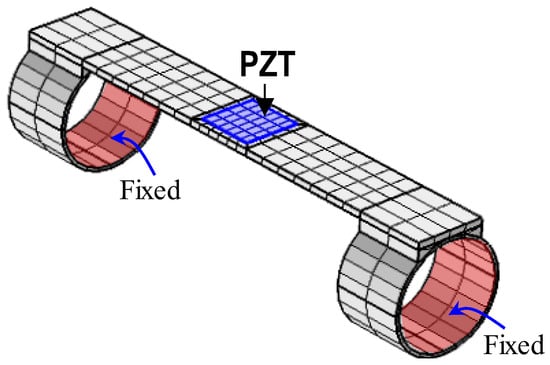 An example design of the wearable interface was selected with the following dimensional parameters: bi × Li × ti = 10 × 50 × 1 mm for the flexible part, db × Lb × tb = 16.2 × 10 × 1 mm for the hoop part (or contact part), and ba × la × ta = 8 × 8 × 0.127 mm for the PZT patch. A finite element (FE) model of the PZT interface was established using a commercial program, COMSOL Multiphysics, as shown in Figure 4. For simplification, the bolted joints were not simulated. A previous study by Islam and Huang [36] showed that when the host structure undergoes flexural deformations, the effect of bonding layer on the resonant frequencies is slight and can be negligible. Thus, the bonding layer between the PZT and the flexible part was not modeled. The fixed boundary condition was applied to the inner surfaces of contacting hoops of the PZT interface, see Figure 4.