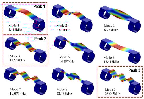 The impedance response of the wearable PZT interface was analyzed under the swept frequency of 1–32 kHz. The real part of impedance was plotted in log-scale against the swept frequency, as shown in Figure 5. The figure shows the first, second, and third peak frequencies at 2.11 kHz, 11.55 kHz, and 28.54 kHz, respectively. For comparison, the modal analysis of the wearable PZT interface was also conducted. The first nine mode shapes representing the local vibrations of the interface were obtained as shown in Figure 6. Among them, Modes 1, 2, 4, 7, and 9 are longitudinal bending motions; mode 6 is a lateral bending motion; and modes 3, 5, and 8 are longitudinal twist motions.