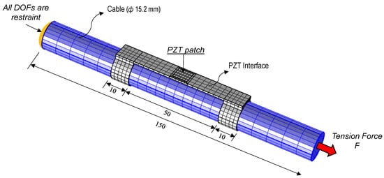 The fixed boundary condition was applied at one end of the axial member, and the tension force F was introduced at the other end, as shown in Figure 7. The FE model was discretized by 3D solid elements. The meshing includes 24 elements for the PZT patch, 440 elements for the interface body, and 1080 elements for the cylindrical structure. The material properties of the cylindrical structure are the same as those of the interface body, as listed in Table 2.