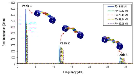 Five cases of the tension force (F0–F4) were introduced into the test structure, as listed in Table 4. From the analysis in Section 3.2, the sensitive frequency range that contains the modal frequencies of the PZT interface was 1–32 kHz. Therefore, the impedance signatures in 1–32 kHz were numerically acquired from the PZT interface under the five cases of tension forces, as shown in Figure 8. As identified previously, the first impedance peak (Peak 1) corresponded to the first bending mode, the second impedance peak (Peak 2) corresponded to the third bending mode, and the third impedance peak (Peak 3) was identical to the fifth bending mode of the PZT interface.