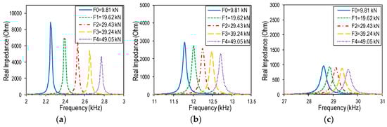 The three frequency bands containing the three impedance peaks (i.e., 0.6–1.0 kHz, 3.6–4.2 kHz, and 9.2–9.4 kHz) are shown in detail in Figure 16a–c, respectively. Under an increased cable force, the frequencies of Peak 1 and Peak 2 were sensitively shifted to the right, while the third peak had no apparent trend. Particularly, when the cable force was increased from F1 = 0 kN to F3 = 19.62 kN, the frequency of Peak 1 shifted from 0.67 kHz to 0.9 kHz (230 Hz increase), and the frequency of Peak 2 changed from 3.76 kHz–4.02 kHz (260 Hz increase). The increased peak frequencies suggested increments in the modal stiffness of the wearable PZT interface along with increased tension forces.