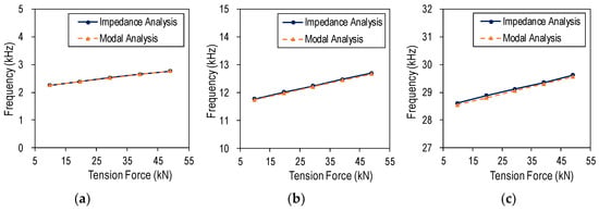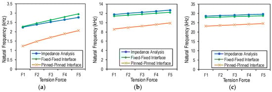 The analytical model of the PZT interface should be determined in order to use a correct prediction formula of the tension force. For this purpose, the natural frequencies of the PZT interface from the analytical solutions (Equation 2) were compared with the impedance analysis results, as shown in Figure 11 and listed in Table 5. It can be seen that the F-F interface model showed similar natural frequencies with the impedance analysis, while the P-P interface model showed lower values. The results suggested that the analytical model of the PZT interface should have F-F boundary conditions.