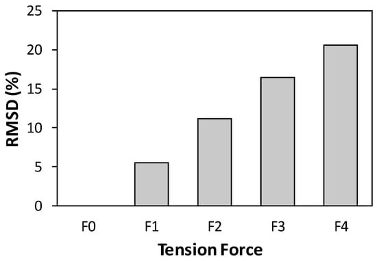 Figure 12 shows the RMSD metric plotted according to the level of tension forces. The RMSD was computed using the impedance data in the frequency band of 1–32 kHz. As observed from the figure, the RMSD value was increased linearly from 0% to 20.6% when the tension force rose from F0 = 9.81 kN to F4 = 49.05 kN. The increased value of the RMSD suggested the variation of tension forces. As discussed previously, the RMSD index reveals only the statistical change in impedance signatures that are not physically related to the mechanical properties of the host structure. Therefore, although the tension force change in an axial member can be effectively established by the RMSD metric, it is difficult to interpret the damage quantity using this statistical tool.