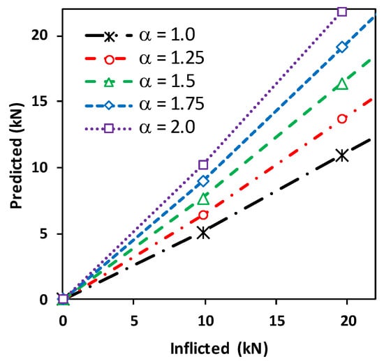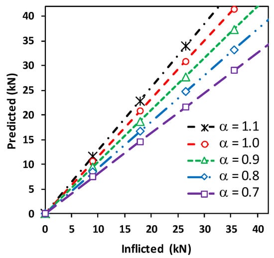 The effect of attachment condition of the wearable PZT interface on the accuracy of tension force estimation was examined by analyzing the load transfer capability factor α. The tension force changes in the test structure were computed for various values of α ranging from 0.7 to 1.1. As shown in Figure 13, the larger value of the load transfer factor resulted in the larger value of predicted tension force. It was found that the values close to 0.9 showed a good accuracy of predicted tension forces, and it was noted that α close to 1 shows a nearly complete load transfer (see Equation (4)). In the FE modeling, the PZT interface was perfectly bonded to the axially loaded cylindrical member, so the axial force was well transferred from the test structure to the PZT interface under tensioning. The numerical evaluation not only demonstrated the feasibility of the proposed method but also evidenced that the estimation of the load transfer capability factor was important for accurate axial load prediction.