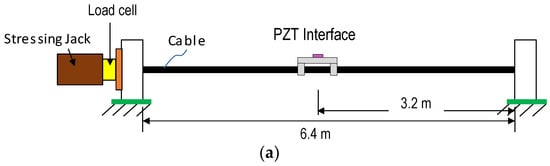 The proposed axial force estimation method via the wearable PZT interface was evaluated on a lab-scale cable model. As shown in Figure 14a, the cable was anchored at the right end and tensioned at the left end using a stressing jack. A load cell was installed at the left end to measure the actual tension introduced into the cable. The cable comprised seven steel wires and was uncovered, as shown in Figure 14b. The steel cable structure had a length of 6.4 m, a nominal diameter of 15.2 mm, a nominal area of 138.7 mm2, a tensile strength of 260 kN, an elastic modulus of 190 GPa, and a unit mass of 1.37 kg/m.