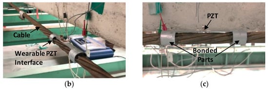 Experimental setup of lab-scale cable structure: (a) schematic of test setup; (b) cable equipped with wearable PZT interface; (c) attachment method.