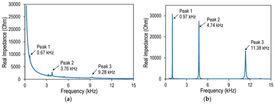 The experimental impedance signatures of the wearable PZT interface under the tension force F1 are plotted in Figure 15a. Within the frequency band of 0.5–15 kHz, there were three distinct resonant peaks at 0.67 kHz (Peak 1), 3.76 kHz (Peak 2), and 9.28 kHz (Peak 3). Figure 15b shows the corresponding numerical impedance signatures simulated by COMSOL Multiphysics. Three distinct impedance peaks were also observed in the numerical signatures. Even though there were certain differences in the peak frequencies between the experiment and the simulation, the experimental impedance pattern was quite consistent with the simulation, suggesting the confidence of the impedance measurement.