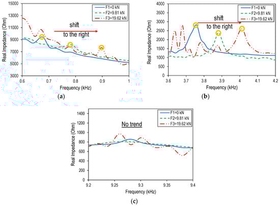 Shifts in experimental impedance peaks due to cable force changes: (a) Peak 1; (b) Peak 2; (c) Peak 3.