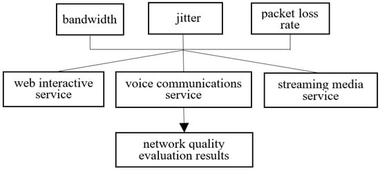 In this paper, we establish a three-layer evaluation model for network applications. We select the evaluation key performance index (KPI) set for delay, jitter, and packet loss rate for the QoS evaluation criteria. Thus, it overcome the one-sidedness of a single evaluation index and achieve multi-index fusion. The layer of the business scheme is divided into three network applications G = {web interactive service, voice communications service, streaming media service}. Figure 3 shows the hierarchical structure of the network performance evaluation model based on application service.