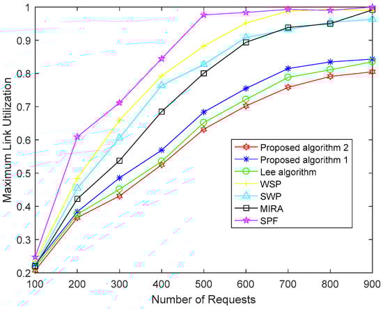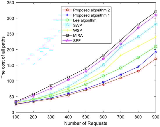 Figure 4, Figure 5 and Figure 6 show a performance comparison of the algorithms when the size of the network is 100 nodes. Figure 4 shows the path costs for SPF, WSP, SWP, MIRA, the Lee algorithm and our proposed two algorithms. The paths cost in the network represents the sum of the consumption of all paths in the corresponding number of requests. The cost of a path obtained by using (11) is the sum of the cost of each link on a path. So, the paths cost depends not only on link utilization but also on the length of the end-to-end path. As shown in Figure 4, the paths cost of the MIRA algorithm is the largest. Because the MIRA algorithm does not consider congestion on non-critical links, large link utilization causes excessive link cost. And the MIRA algorithm avoids the critical links that tend to cause longer paths. The paths cost of SPF is lower than that of MIRA. The SPF usually selects the shortest path, although the algorithm does not consider the remaining bandwidth of the links. SWP and WSP perform better than SPF because they take into account the hop counts as well as the remaining bandwidth of the links. SWP selects the minimum hops path with the largest available bandwidth. WSP selects the largest available bandwidth with the minimum hops paths. SWP has a longer path than WSP. So, the paths cost of the WSP algorithm is less than that of the SWP algorithm. The Lee algorithm takes into account the link criticality and link congestion index. The number of hops of the path is limited. The Lee algorithm performs better than other traditional algorithms, but it does not consider the consumption of the links resource and load balance in the network. Our proposed Algorithm 1 takes the path cost as an optimization goal to achieve the lowest path cost compared to the above five algorithms. The proposed Algorithm 2 makes some improvements in obtaining the global optimal solution and shows the best performance for paths cost.