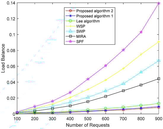 Figure 5 shows the load balance of the network with the seven algorithms. We define the variance of the link utilization on the network as the load balance by using (12). As shown in Figure 5, the performance of SPF for load balance is the worst without considering link utilization. The performance of WSP is better than SPF because WSP selects the path with the largest remaining bandwidth when it has multiple shortest paths. WSP gives priority to the number of hops and SWP gives priority to the residual bandwidth of paths. The performance of SWP is better than WSP in terms of load balance. The main idea of MIRA is to minimize the influence of future nodes to build the link request and thus effectively avoid the congestion of the critical links. The performance of the MIRA algorithm is better than that of SPF, SWP, and WSP. The Lee algorithm considers the link congestion and has a good effect on load balance. Our proposed Algorithm 1 takes load balance as an optimization target and has obtained better performance than the other five algorithms through multiple iterations of the MOPSO algorithm. Our proposed Algorithm 2 finds a better solution and has the best effect by improving the selection mechanism.