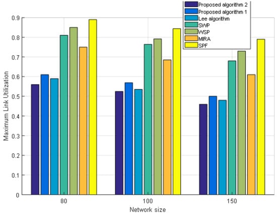 In this section, we compare the performance of our proposed algorithms with the Lee algorithms in [16], SPF [12], WSP [14], SWP [13], MIRA [15] and in terms of link cost, load balance, maximum link utilization and the value of path evaluation. In this paper, we use MATLAB to simulate and randomly generate the Waxman network topology. The probability of having an edge between node u and node v is given by formula , where and are the network characteristic parameters. The larger the , the greater the proportion of the short side relative to the long side. The larger the , the greater the density of the edge. d is the Euclidean distance between any two nodes in the graph, and len is the length of a side of the square area. The generated Waxman topology is 80 nodes with 602 links, 100 nodes with 943 links, and 150 nodes with 2190 links. In the simulation, each source host sends the flow packets to the destination host and each flow packet is in the range of 10 MB to 100 MB. Routing requests are sent 10 times per second [34]. The link capacity is set to 1 GB/s. We take k = 5 when calculating the first k shortest paths.