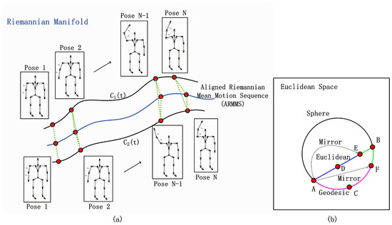 Illustration of the proposed (a) aligned Riemannian mean motion sequence (ARMMS). (b) A and B are the pair of poses in two different sequences and . C and D are the mean points on the sphere and plane, respectively. F and E are mirrors of A for manifold and Euclidean cases, respectively. The difference between A and B in the green on the sphere is larger than in the case on the Euclidean plane, i.e., geodesic .