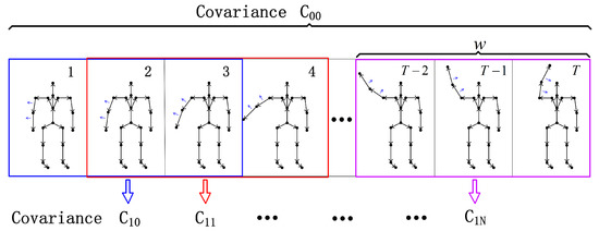 The covariance descriptor has also been used for the tasks of human motion analysis. For human action recognition, the pose variations within a sequence is encoded as a sample covariance descriptor [41,42]. Since the symmetric positive definite (SPD) matrices can be treated as points on the Riemannian manifold, they deal with classification tasks by nearest neighbor (NN) using the log-Euclidean metric. In addition, manifolds can be also mapped to a reproducing kernel Hilbert space (RKHS) via the kernel trick [43,44,45]. However, the elements in the covariance descriptor contain the unique skeleton information of each individual, and this descriptor does not enclose temporal evolution information of motion sequences. Therefore, the traditional method cannot be used directly in the task of individual identification. In order to encode the temporal dependency of geometric features over time, we use hierarchical covariance matrices, each covering a sub-sequence of the input sequence. Different from proposed by [46], which models variations in the joints in Euclid space, the proposed approach encodes the dynamic variations of Riemannian geometric features into hierarchical covariance matrices. For each sequence, the covariance matrix can be described as a symmetric matrix . The covariance matrix of the range of frames from to can be calculated as follows: