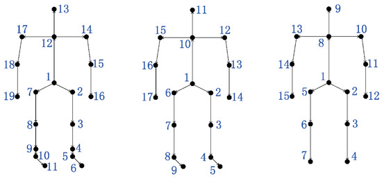 The CMU Mocap database contains an extensive collection of data with respect to walking sequences of different subjects. However, the length of sequences varies largely, which may lead to sample imbalance, and there was no unified rule for walking process. In this experiment, subjects with more than 20 cycles and who walked straight were chosen. We select seven walking subjects (#7, #8, #12, #15, #16, #35, #39) that performed 140 walking cycles in total, with 20 cycles per subject. As shown in Figure 4(left), we used a skeleton with 19 joints. To quantitatively evaluate the performance, we compared our method with seven baselines [31,53,54,55,56,57,58].