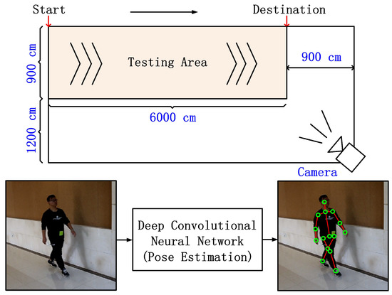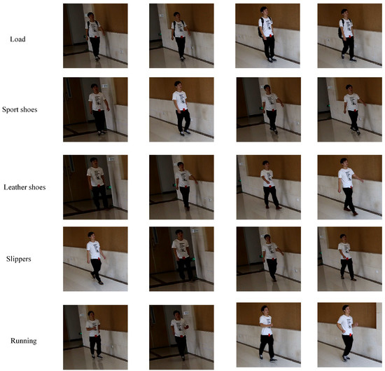 In our database, we recorded walking and running sequences from 20 individuals (10 males and 10 females). In addition, shoes and carrying condition were used for an exploratory factor analysis of walking recognition. For the first factor, we recorded the three types of shoes for each individual including sport, slipper, and leather shoes. For the second factor, we recorded the sequences where the person carries a backpack of eight kilograms on his/her back. For each impact factor, we recorded 10 cycles of motion for each individual. The camera was placed at 1.20 m above the ground and at 15 degrees relative to the starting point of the walking line. The 3D poses were captured by a unified deep neutral network that presents a two-stage cascaded structure [62]. An overview of our capture system is illustrated in Figure 6. In our database, each individual was asked to walk and run at his or her preferred speed through a straight course. The length of the course was approximately 6 m. We used a 7D camera manufactured by Canon Inc. The original image size and frame rate were pixels and 50 fps, respectively. In order to reconstruct the 3D pose from each frame, each frame was cut to a man-centered size of . Figure 7 shows example frames in walking sequences of Subject 6. The source codes and data (RGB and 3D skeleton sequences) will be available at our research group website.