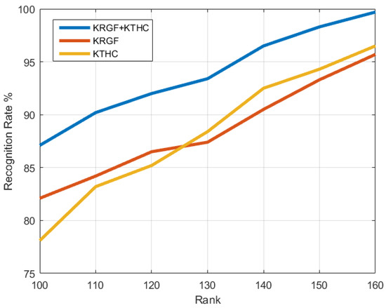 Figure 8 shows the recognition accuracy of the proposed approach in walking sequences versus feature dimensions. We can see that the fusion feature (KRGF+KRTHC) outperforms both the kernelized Riemannian geometric feature (KRGF) and the kernelized Riemannian temporal hierarchy of covariance (KRTHC) feature by a considerable margin. Specifically, the KRTHC feature can model pose variations within a sequence, but it may ignore the important local differences between individuals. Combining the local features encoded by the KRGF and the large-scale temporal features produced by the KRTHC feature, the proposed approach can simultaneously capture the varying spatial distribution of motion and its temporal variations.