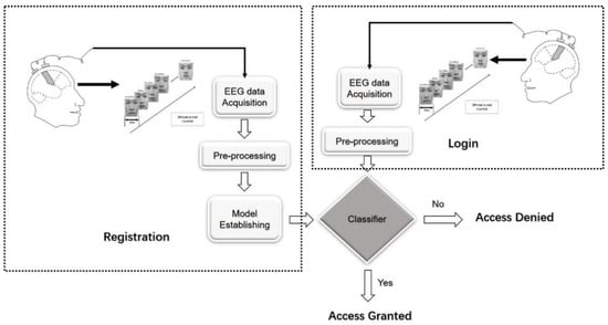 Identity authentication is an essential safety precaution in many fields, including national security, public security, e-commerce, etc. Conventional authentication systems are based on passwords that are entered with a keyboard, touch screen, or mouse. More recent approaches employ biometric mechanisms, especially approaches based on neural activities (which are currently being explored). Compared to conventional biometrics, such as faces, fingerprints or DNA, brain biometrics [] offers interesting advantages. Brain biometrics cannot be acquired from a deceased person; furthermore, they are difficult to coerce, since threats of violence or blackmail are very likely to put significant stress on the user, and stress will strongly impact an individual’s brain activities []. Electroencephalogram (EEG) signals, which originate from neurons in the brain, have drawn considerable interests from researchers, due to its ease of use, portability, low cost and high temporal resolution []. Since an individual’s neural activity pattern is unique [], it is impossible to imitate one’s mind [], and circumvent the biometry field []; this biometric trait may change the traditional “pass-word” into “pass-thought”.