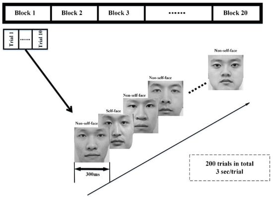 During the registration section, subjects in the user group are regarded as legal users, and a specific face image sequence is designed for each subject in the user group. For each trial, there is one face image of the user as the self-face image and nine face images selected randomly from the non-user face image set as the non-self-face images. The duration time for each image is 300 ms. The presentation order of the self and non-self-face images in each trial is randomized to avoid the effect of subject prediction on the next stimulus. This section consists of 20 blocks, and each block consists of 10 trials (for trials in the same block, the face images are the same but in random orders; for trials in different blocks, the self-face image is the same, while the non-self-face images are different among blocks), as shown in Figure 2. A short rest comes after 10 blocks. Subjects are asked to focus on the specific face image sequence, while their EEG signals are collected synchronously and an authentication model for each specific user is generated using these signals.
