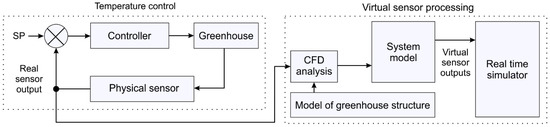 A model-based virtual sensor needs a real sensor output and a system model—or transfer function—to create a new sensor; see Figure 1. The aim of this study was divided into two objectives: temperature control and virtual sensor processing. To achieve the first objective, a greenhouse was designed, modeled, and fabricated; the control strategy was proposed to establish real sensor output. To achieve the second objective, the real sensor output was used as an input signal in the virtual sensor processing stage, resulting in a 3D real-time simulator that was based on virtual sensors for temperature monitoring. To establish the greenhouse system model, both the real sensor output and the CFD analysis were used.