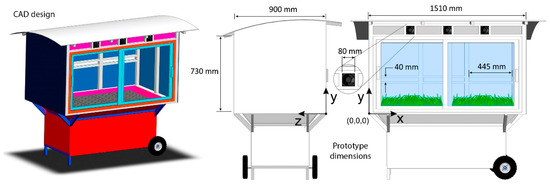 To conduct this study, a greenhouse was designed. For experimental purposes, the greenhouse´s overall dimensions were selected as 1510 mm (length) × 900 mm (width) × 730 mm (height). Figure 2 shows the greenhouse design that included all necessary elements—inlets, outlets, heaters, and fans—for supporting temperature control. The electric resistance heaters were located behind the fans. These fans introduced air into the greenhouse.