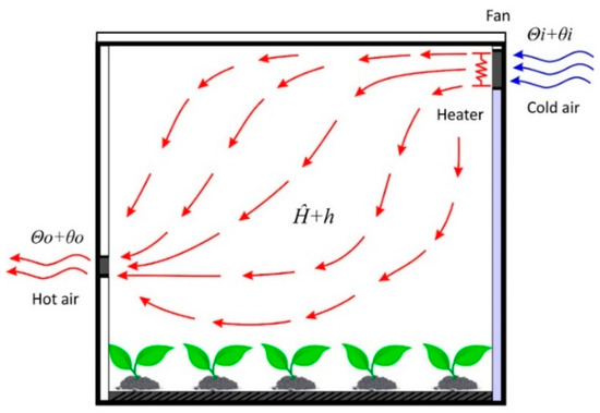 Controllers are always related to mathematical models [48,49]. For this study, the controller was proposed based on the convection heat transfer equation. Certain assumptions and conditions were assumed, such as heat loss being considered as negligible, there was no heat storage in the insulation, and the air flow in the greenhouse was evenly distributed. Figure 3 shows the schematic model of the greenhouse air heating system, which is explained below.