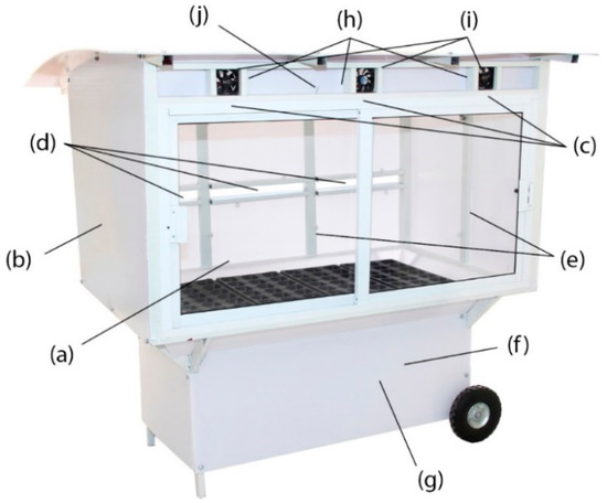 The proposed design was then fabricated for experimental tests, as shown in Figure 4. The main structure of the greenhouse was made of steel and protected with a thin layer of white paint (a). The greenhouse walls were made of 3 mm thick polycarbonate (b). Three air inlets were installed in the front of the greenhouse (c). Three air outlets were installed in the back of the greenhouse (d). Two glass sliding doors were installed in the front of the greenhouse (e). One acquisition card (NI USB 6009) was selected to support the analog and digital data conversion (f). The sampling time of this card was set to 100 ms. Two drivers were manufactured to control the current to the fans and the electric resistance heaters (g). Three electric resistance heaters were installed to heat the inlet air (h). Three fans were installed to bring air into the greenhouse (i). One real temperature sensor was installed (j) and the resolution was 14-bit with an accuracy of ±0.3 °C.