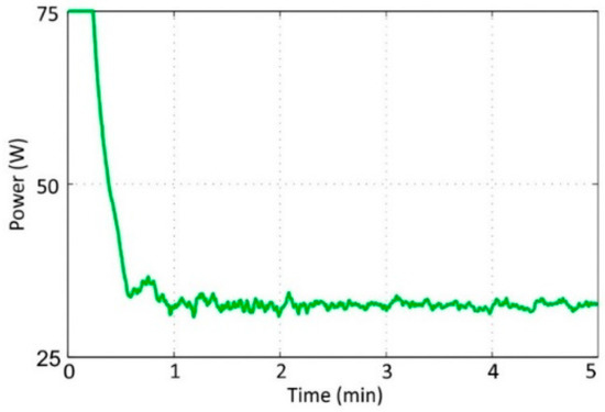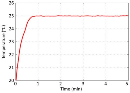 To assess the performance of the controller, the set point was established at 25 °C and the experiment time was set as five minutes. The temperature was monitored and recorded with a sampling time of one second. Figure 5 shows the result that was obtained from the real sensor output. The implemented controller reached the set point in less than 45 seconds and maintained the desired temperature. It demonstrated an accuracy of ±0.3 °C. The controller output was limited to 75 W to avoid overheating the system’s hardware; see Figure 6. The controller output used 75 W to reach the set point and 30 W to maintain steady state. These experimental results indicated that the proposed controller was adequate for the next step—virtual sensor processing.