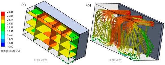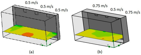 Three different inlet air speeds were proposed. Figure 9a shows the temperature contours using the same inlet air speeds (0.5 m/s). Figure 9b shows the temperature contours using different inlet air speeds (0.75, 0.5, and 0.75 m/s). A comparison of both results indicated a difference in the temperature distribution. In this study, the inlet air speeds were considered to be constant.