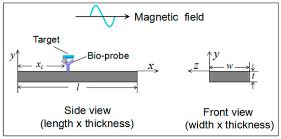 Assume the target is loaded on an ME biosensor that is vibrating in a liquid, as shown in Figure 1. Here, we chose the commercial available ferromagnetic alloy Metglas 2826MB (Fe40Ni38Mo4B18) as the sensor platform materials, which has been widely used in ME biosensors. The detailed information of the sensor, liquid and the target loading conditions for this study is listed in Table 1.