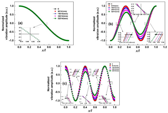 Vibration mode shapes of the sensor in air and in liquid with different viscous damping coefficient: (a) first-order resonance; (b) third-order resonance; and (c) fifth-order resonance. Here, the target loading position xc/l = 0.1 is used as an example.