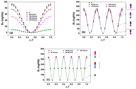 Sm as the function of target loading position in the liquids with different viscous damping coefficient under: (a) first-order resonance; (b) third-order resonance; and (c) fifth-order resonance.