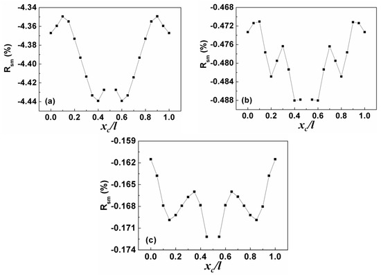 Rsm as the function of loading position in the liquid with viscous damping coefficient of 80 N/(m/s) under: (a) first-order resonance; (b) third-order resonance; and (c) fifth-order resonance.