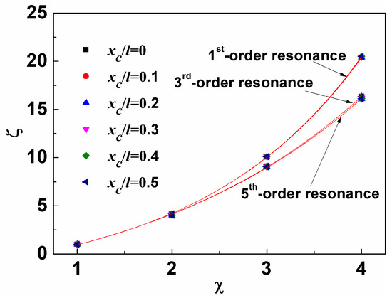 Figure 6 shows the Sm as a function of viscous damping coefficient for different loading positions. We can see that all data for the same loading position can be well fitted by an exponent decaying function. In other words, with the increase of viscous damping coefficient, Sm decreases and tends to approach each other but the tendency becomes weaker at high-order resonance. In addition, when the target is loaded close to the nodes, the contribution of viscous damping coefficient to the decrease of Sm gradually reduces. Taking the fifth-order resonance as an example, the slopes of the curves for xc/l = 0.1, 0.3, and 0.5 are close to or equal to zero, which is due to the three nodes near x/l = 0.1, 0.3, and 0.5, respectively.