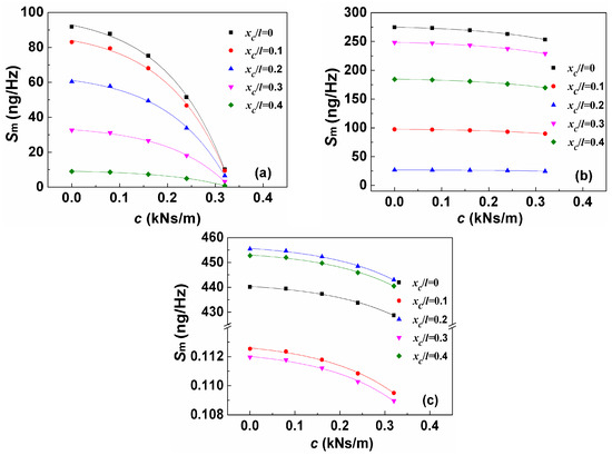 Sm as the function of viscous damping coefficient c for different loading positions under: (a) first-order resonance; (b) third-order resonance; and (c) fifth-order resonance.