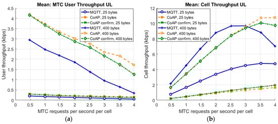 Figure 2b shows how the system reaches its saturation point earlier for MQTT. This can be seen as the point where the cell throughput reaches its peak. When the cell throughput starts decreasing under load the air interface is no longer efficiently used. The second curve to start bending downwards is the CoAP confirm case. CoAP with no confirm reaches its saturation point outside of the plot area.