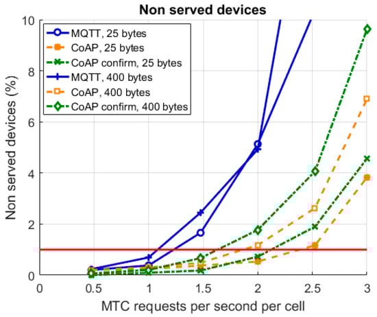 Service availability is defined in this study in terms of delivery delay. In case the system has not been able to deliver the data transmission from the device to the cloud in 20 s, the device is considered as non-served. As can be seen in