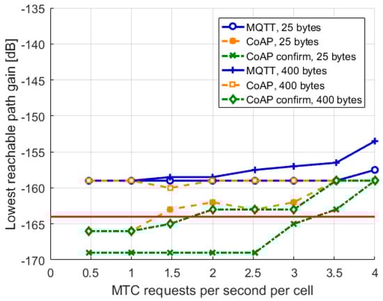 Figure 4, where we show the served devices with the lowest reachable path gain. Two observations can be made from the figure: first, the lowest reachable path gains for MQTT are on average higher than the lowest reachable path gains for CoAP. Also, enabling CoAP confirm helps to reach devices in deep coverage better. This basically hints that CoAP service has a better coverage than MQTT service, especially when confirm is used. Second, as load increases, the lowest reachable path gain also increases. It seems that as the increased number of devices in the system demand more system resources, the devices in deep coverage are left without. Thus, it seems that in high load, the system is not able to allocate enough resources for users in bad coverage.