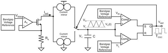 In Figure 1, the schematic of a typical R-T converter is shown. It consists of a first block which converts the resistance value into a current, followed by a current-controlled relaxation oscillator. In the first stage, a constant voltage provides biasing to the sensor and produces a current inversely proportional to the sensor resistance , = . The robustness of this block is therefore determined by the stability of the biasing voltage .