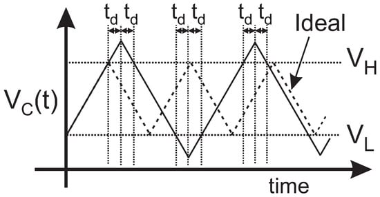 Delay is another error source to consider. The comparison function and the change in the current direction are performed with a certain delay and, consequently, the voltage surpasses and , as shown in Figure 2. As can be seen, the delay is added four times in each period , resulting in a non-linear relationship between the sensor resistance and the period of the oscillation. To keep the output period linearly dependent on , it is necessary either to reduce the delay or, if the application does not require high frequency operation, as in the case of gas resistive sensors, to choose an output period such that remains negligible for all the output range.