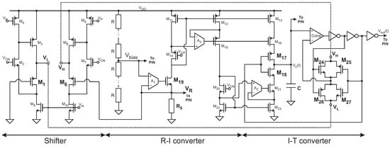 As explained in Section 2, the key of the proposal is to use the same reference voltage for the R-I and the I-T converter. In this particular implementation, a level shifter is used to convert the voltage set across the sensor, , to a potential difference . A pair of cascoded Flipped Voltage Followers (FVFs) [], – and – in Figure 3, are used to shift the ground and voltage by the same amount. Their extremely low output resistance keeps and almost constant even during transitions in the transmission gates ( to ). If changes, so does in the same proportion.