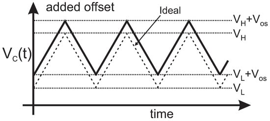 In [,,], two comparators and a R-S flip-flop to control the switches are used. Note that this introduces an additional error source in the period value of the output signal due to the input offsets. Therefore, high accuracy implementations to cancel this offset are necessary []. In contrast, when using only one comparator as in our proposed circuit, the input offset equally affects both comparison levels and its effect is cancelled, as illustrated in Figure 7 for a positive offset.